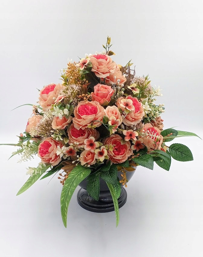 Stroiki oraz wazony zostały wykonane z dbałością o detale. Każdy zestaw zawiera kompozycje kwiatowe z wysokiej jakości kwiatów sztucznych, w tym zestawie: róża w otoczeniu soczystej zieleni i licznych dodatków.