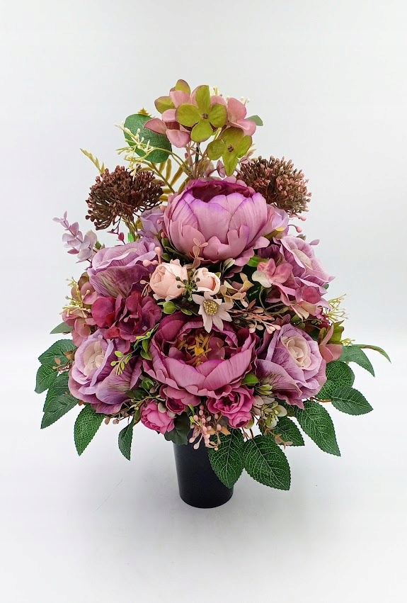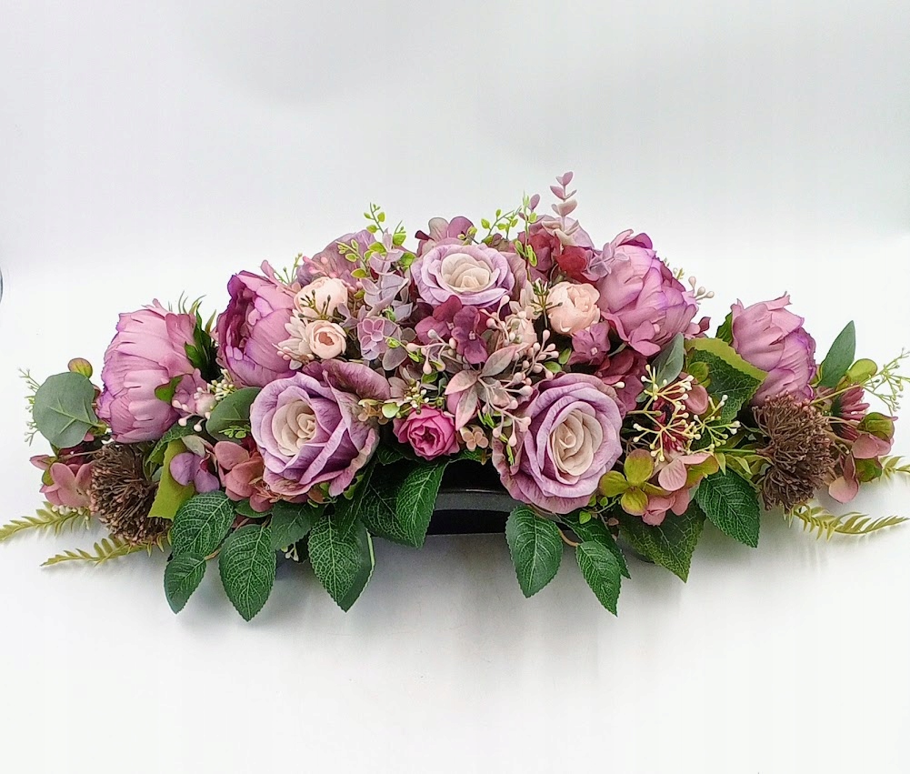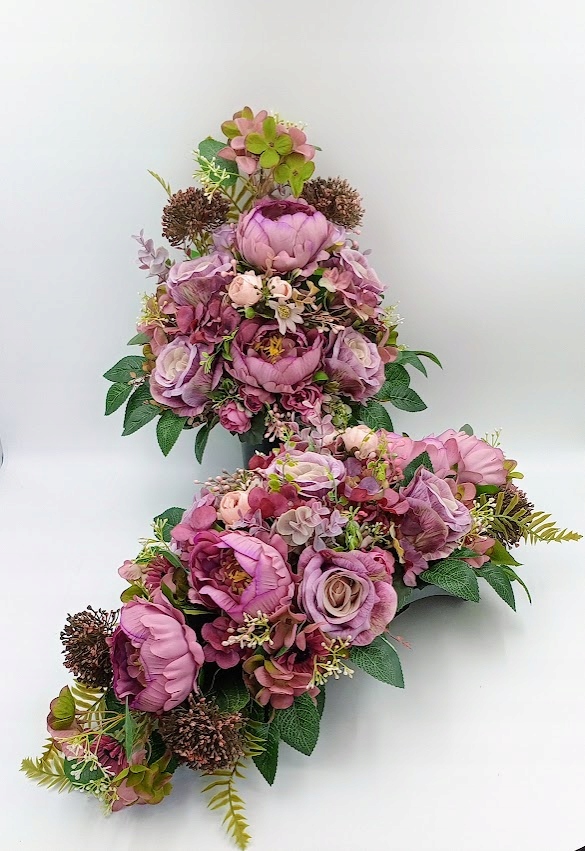 Stroiki oraz wazony zostały wykonane z dbałością o detale. Każdy zestaw zawiera kompozycje kwiatowe z wysokiej jakości kwiatów sztucznych, w tym zestawie: piwonia, róża w otoczeniu soczystej zieleni i licznych dodatków.