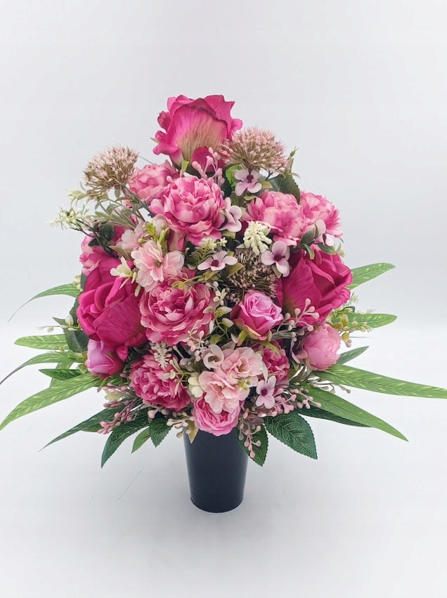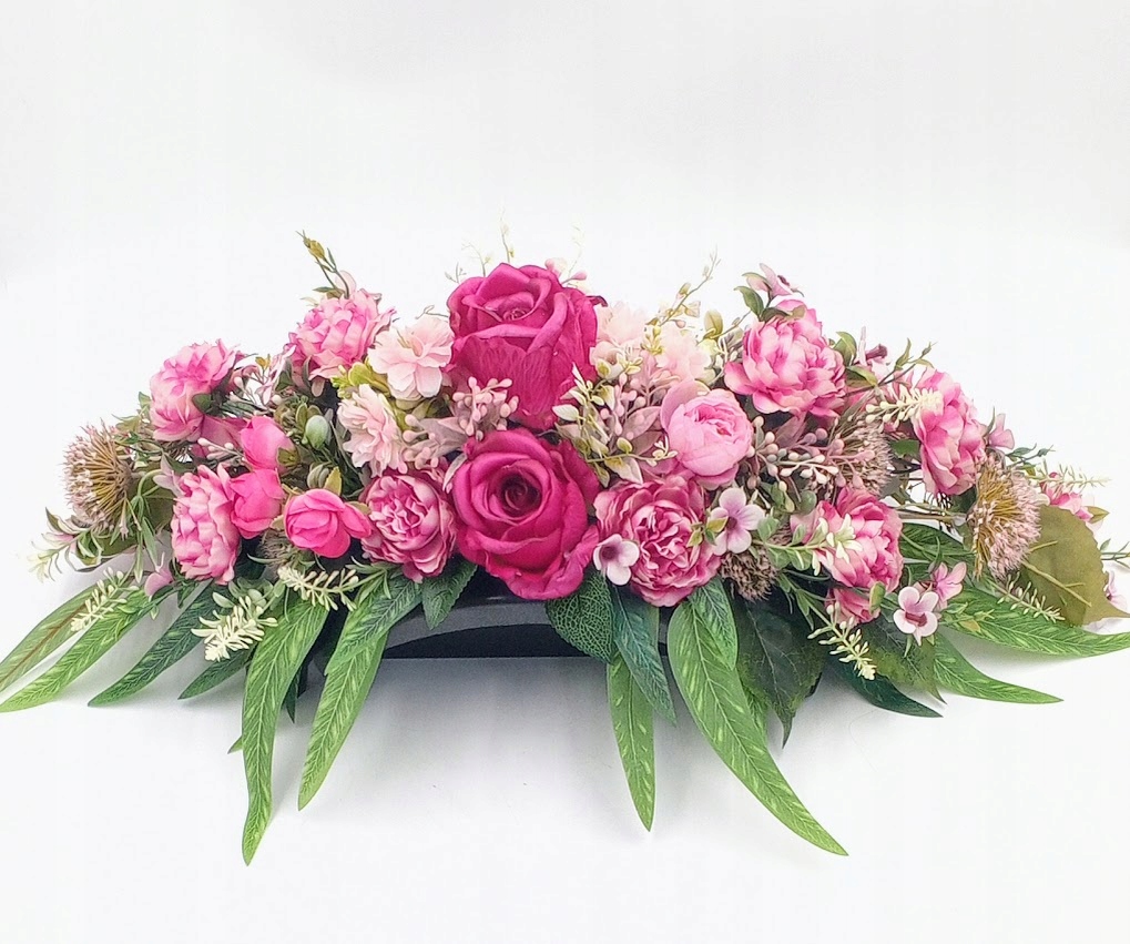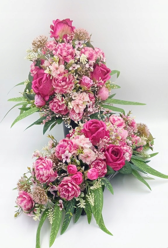Stroiki oraz wazony zostały wykonane z dbałością o detale. Każdy zestaw zawiera kompozycje kwiatowe z wysokiej jakości kwiatów sztucznych, w tym zestawie: róża w otoczeniu soczystej zieleni i licznych dodatków.