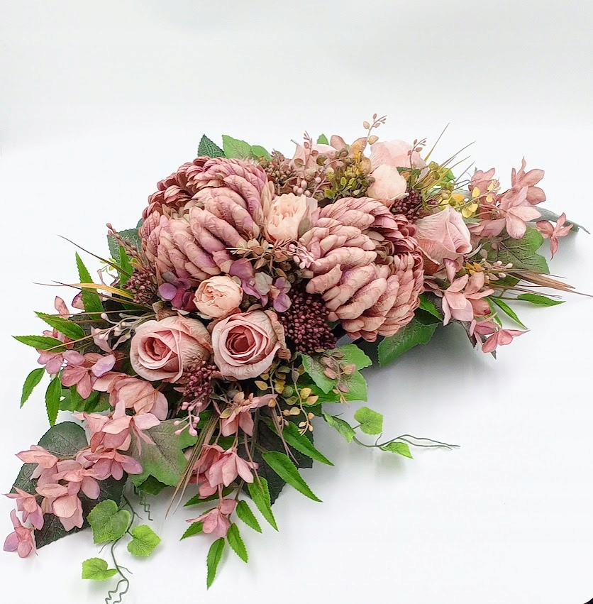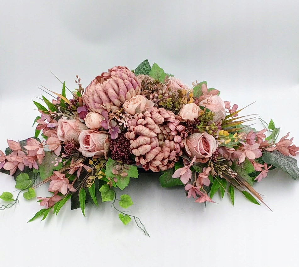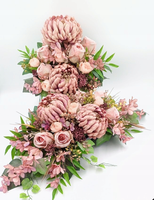 Stroiki oraz wazony zostały wykonane z dbałością o detale. Każdy zestaw zawiera kompozycje kwiatowe z wysokiej jakości kwiatów sztucznych, w tym zestawie: chryzantema i róża w otoczeniu soczystej zieleni i licznych dodatków.