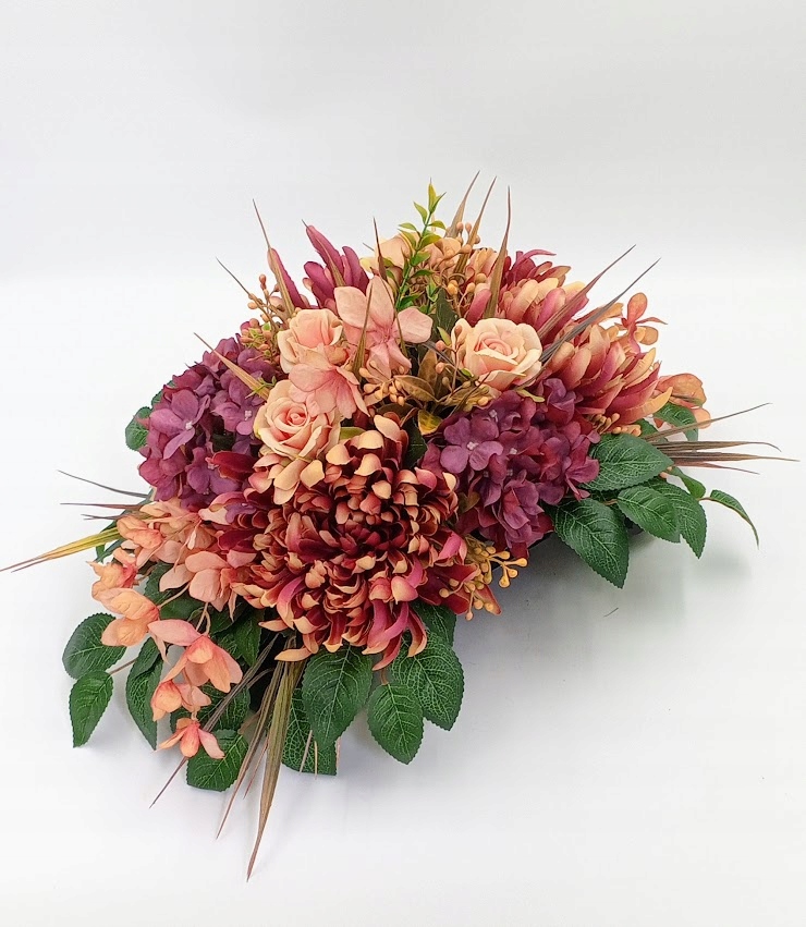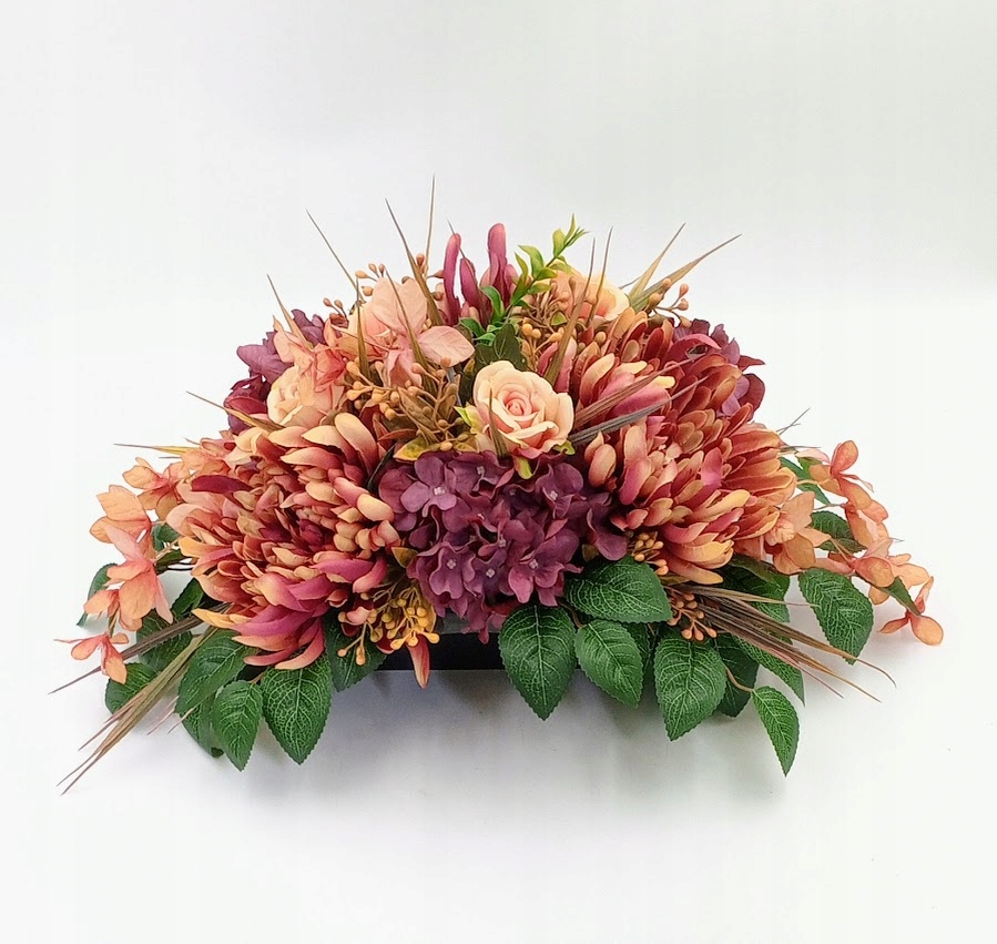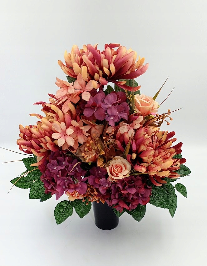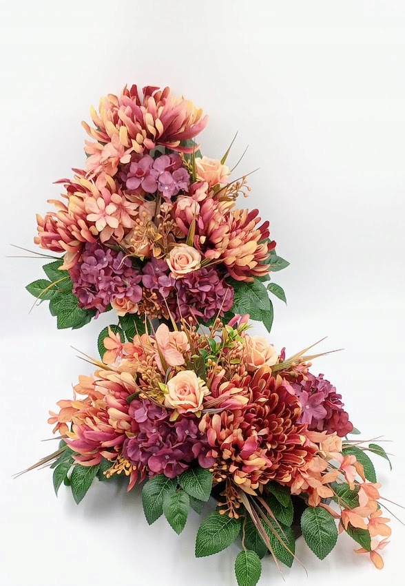 Stroiki oraz wazony zostały wykonane z dbałością o detale. Każdy zestaw zawiera kompozycje kwiatowe z wysokiej jakości kwiatów sztucznych, w tym zestawie: chryzantemy, róże w otoczeniu soczystej zieleni i licznych dodatków.