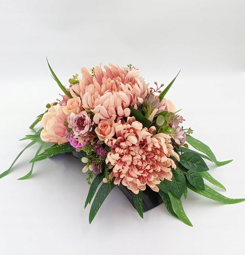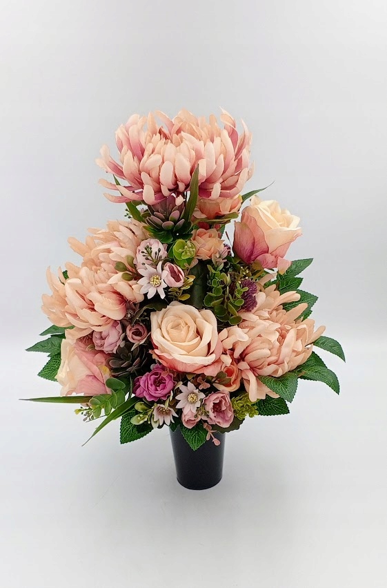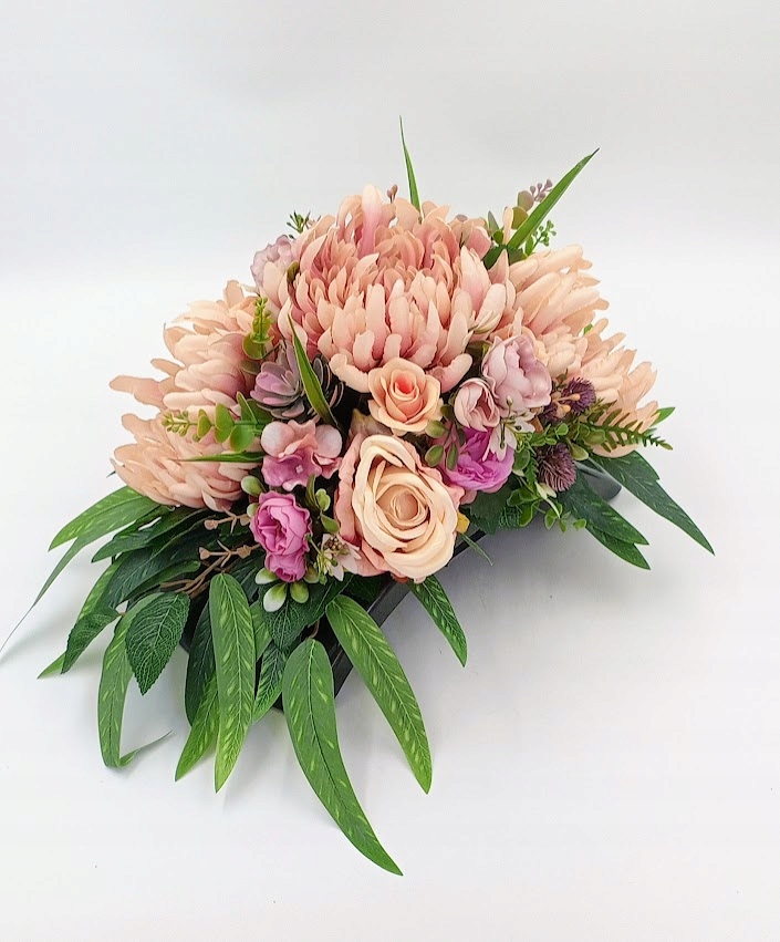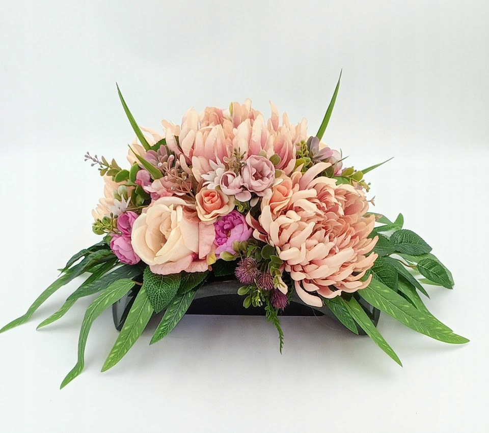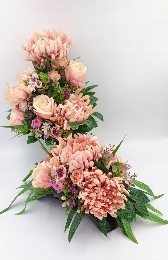 Stroiki oraz wazony zostały wykonane z dbałością o detale. Każdy zestaw zawiera kompozycje kwiatowe z wysokiej jakości kwiatów sztucznych, w tym zestawie: chryzantemy, róże w otoczeniu soczystej zieleni i licznych dodatków.